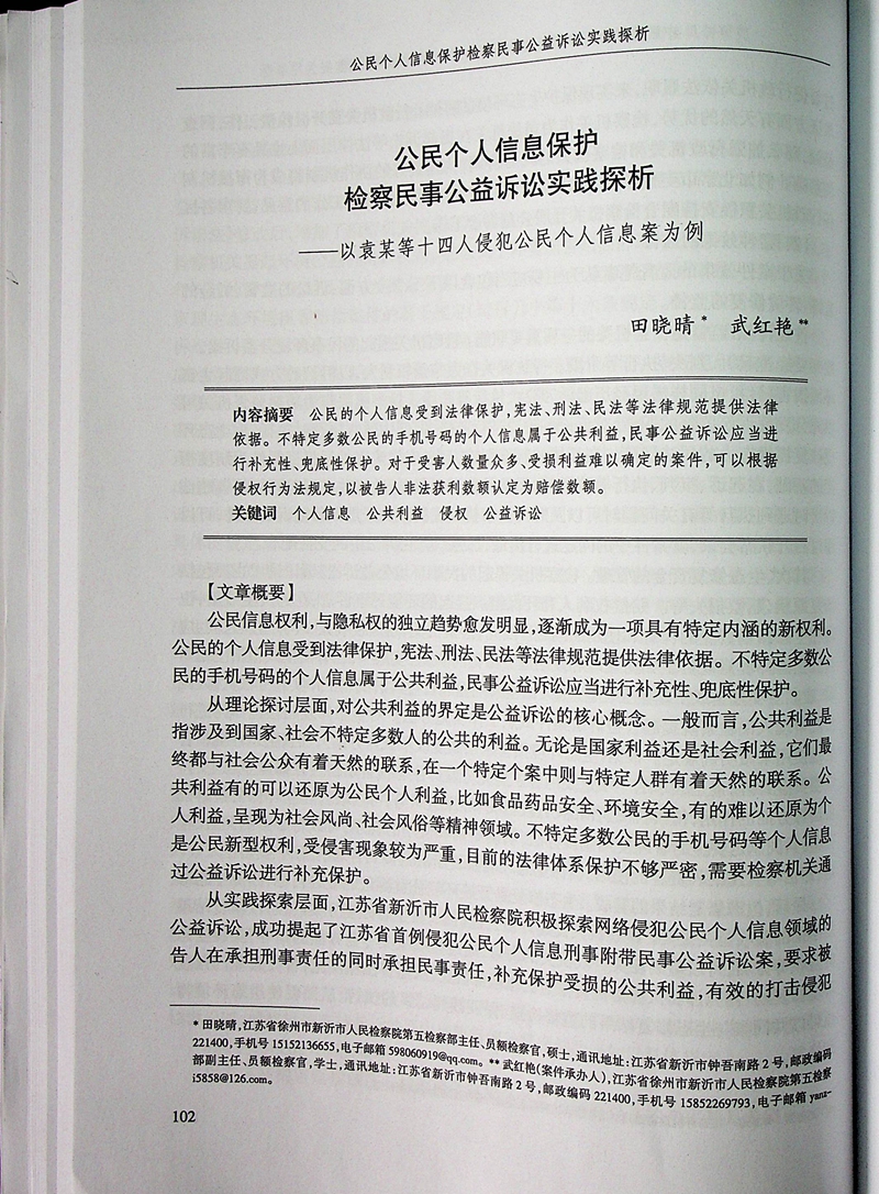 新沂市检察院第五检察部主任田晓晴作为论文作者受邀参会,并在会议现场播放了新沂市检察院制作的公益诉讼宣传片《为这一方水韵乡愁》,取得良好反响。该次年会共收到论文229篇,其中51篇论文被编入《中国法学会民事诉讼法学研究会2020年年会论文集》,新沂院田晓晴、武红艳共同撰写的论文《公民个人信息保护检察公益诉讼实践探析》入选该年会论文集。